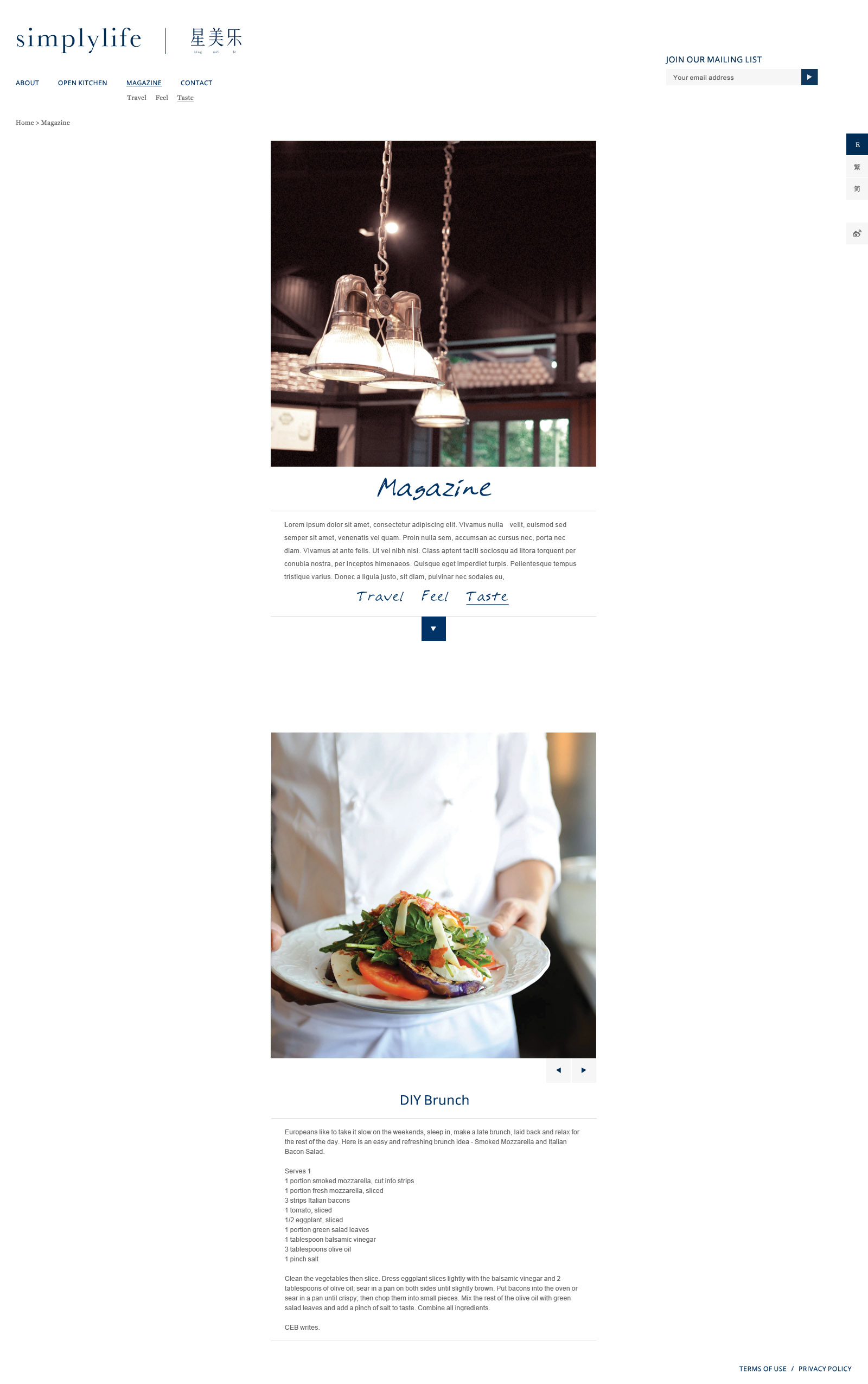 Simplylife is a famous restaurant group in Hong Kong, bringing an organic and healthy dining experience to the customer. Beside their food, they published magazine amd newspaper to promote "Simplylife" living style - Simple, Healthy, Relax and Authentic. This project is to build their official website. By using a free flow grid system, filled with the quotes and images that matching their lifestyle, created a content based website that is subtle and minimal.